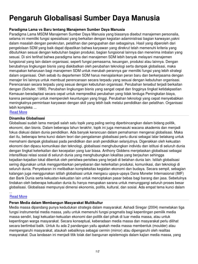 Mengenal lebih dekat 3 tantangan paling besar dalam human resource management a 1. Tuntutan untuk berkompetisi dan tekanan institusi global, seperti imf dan world bank, mau atau tidak, membuat dunia politik dan pembuat kebijakan harus berkompromi untuk melakukan perubahan. Dampak positif dan negatif globalisasi dapat kita rasakan disekeliling. Definisi globalisasi secara sederhana berarti percepatan gerakan dan pertukaran (manusia, barang, dan jasa, modal, teknologi, atau praktik budaya) yang terjadi secara luas. Ketika sebuah negara sudah mengalami globalisasi, maka ada berbagai barang dan orang asing yang masuk untuk bekerja. Dampak positif globalisasi meningkatnya kedisiplinan dan etos kerja yang dimiliki oleh masyarakat. Untuk itulah kamu perlu melakukan persiapan. Latar belakang internet merupakan sebuah penamuan dan mahakarya terbesar yang pernah ada. Dampak globalisasi terhadap perkembangan msdm dan sdm 27 des. Globalisasi memiliki dampak atau pengaruh yang sangat besar pada bidang ekonomi. Adanya globalisasi memberikan dampak positif dan negatif dalam kehidupan bermasyarakat dan bernegara. Dampak positif globalisasi terhadap politik 1. Perkembangan di dunia internet semakin lama semakin mengalami kemajuan.